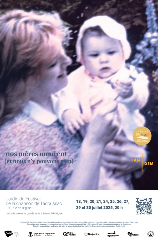 Nos mères meurent (et nous n’y pouvons rien) du 18 au 30 juillet 2025 dans le Jardin du Festival de la chanson de Tadoussac ou dans le sous-sol de l’église en cas d’intempéries
